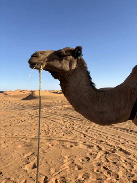 砂漠が見えてきて、ついにらくだトレッキングです。らくだ使いの方も優しくて、夕日が沈むまで写真を撮ってくれました。夜は皆んなでキャンプファイヤーをしたりジャンベという太鼓を叩かせてもらったり、砂漠に上って夜空を見上げたり、楽しい時間を過ごしました。砂漠にあるテントは想像以上に素敵なお部屋でした。部屋に暖房はなかったのでカイロが役立ちました。