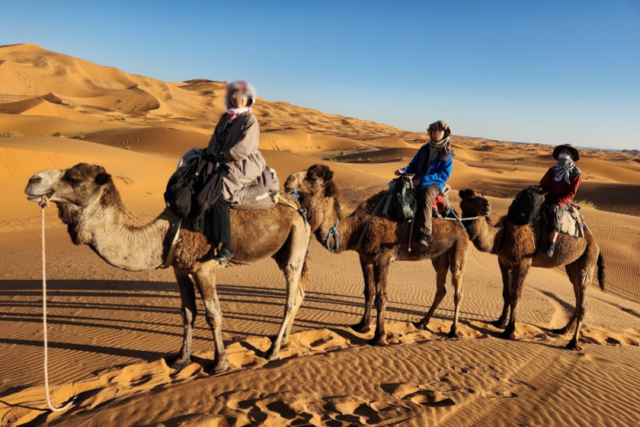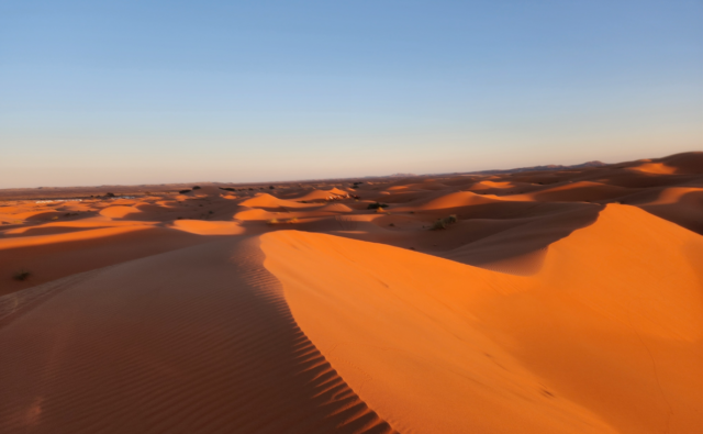 ハイライトは何といっても砂漠でした。メルズーガで別の車に乗り換え、ラクダたちが待つ場所まで移動。ハミドさんとはしばしのお別れです。スーツケースは別便でテントまで運んでもらいました。ここからはジュラバを着たラクダ使いのおじさんに連れられ、サンセットまでの2時間余りをラクダに揺られて砂漠を満喫。オレンジ色に染まる数多の砂丘が地平に広がり、真っ青な空の下、私たちの他に誰もいません。幸い風ひとつなく(カメラに巻いたラップも必要なく)、時間が止まったような、まるで映画の中に入り込んだような感覚に襲われました。この旅で最も心に残る瞬間でした。