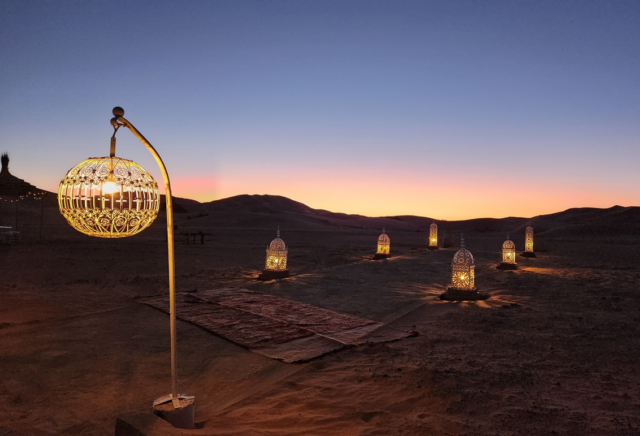 テント入口のランプが幻想的な雰囲気を醸し出し、宿泊客を別世界へいざなってくれます。モンゴルのゲルのような頑丈なつくりで、シャワーと水洗トイレがあり、ベッドも大きく快適でした。食事は隣のプレハブハウスで提供され、リアドと遜色ありませんでした。砂漠の真ん中にこのような宿泊施設があるなんてちょっと信じられませんでしたが、ソーラー発電が完備されているのかなと想像。キャンプファイアーも終わり消灯を過ぎた夜半、テントの外に出てみると、頭上に満天の星が!360度ぐるりと広がる星空が私たちを包み込むようでした。防寒着をまとって2時間余り、ベンチチェアに寝ながら星を眺めました。キョウコさんから教えてもらった星空アプリを入れて、お目当ての星にスマホを向けると星座が出てきます。まさしく天然プラネタリウム、夢が叶った夜でした。